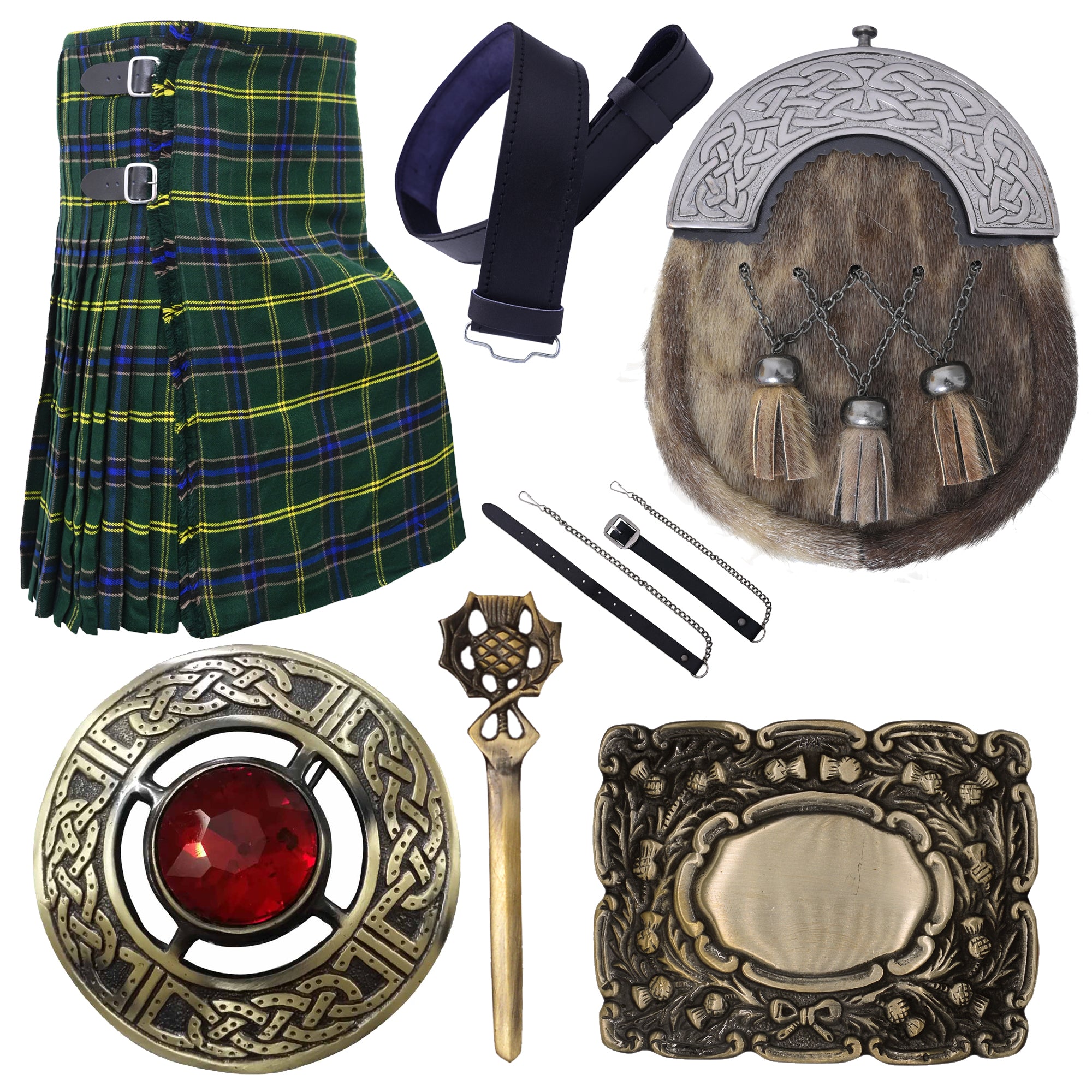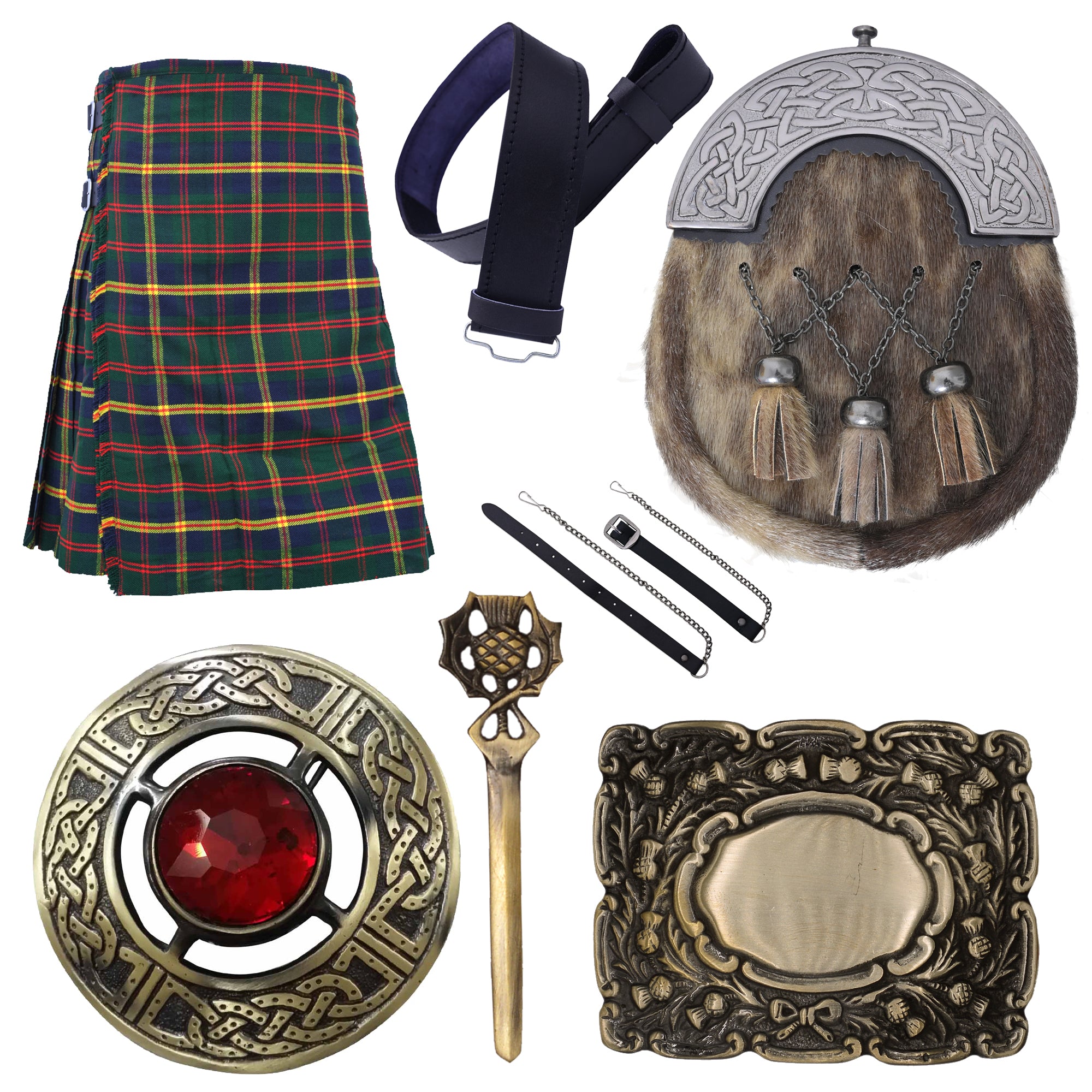 Men's Scottish Kilts 6 pieces Set-Traditional Highland Wear Full dress kilt outfits , Leather Sporran Kilt Belt with Buckle , Traditional premium Kilt Outfit